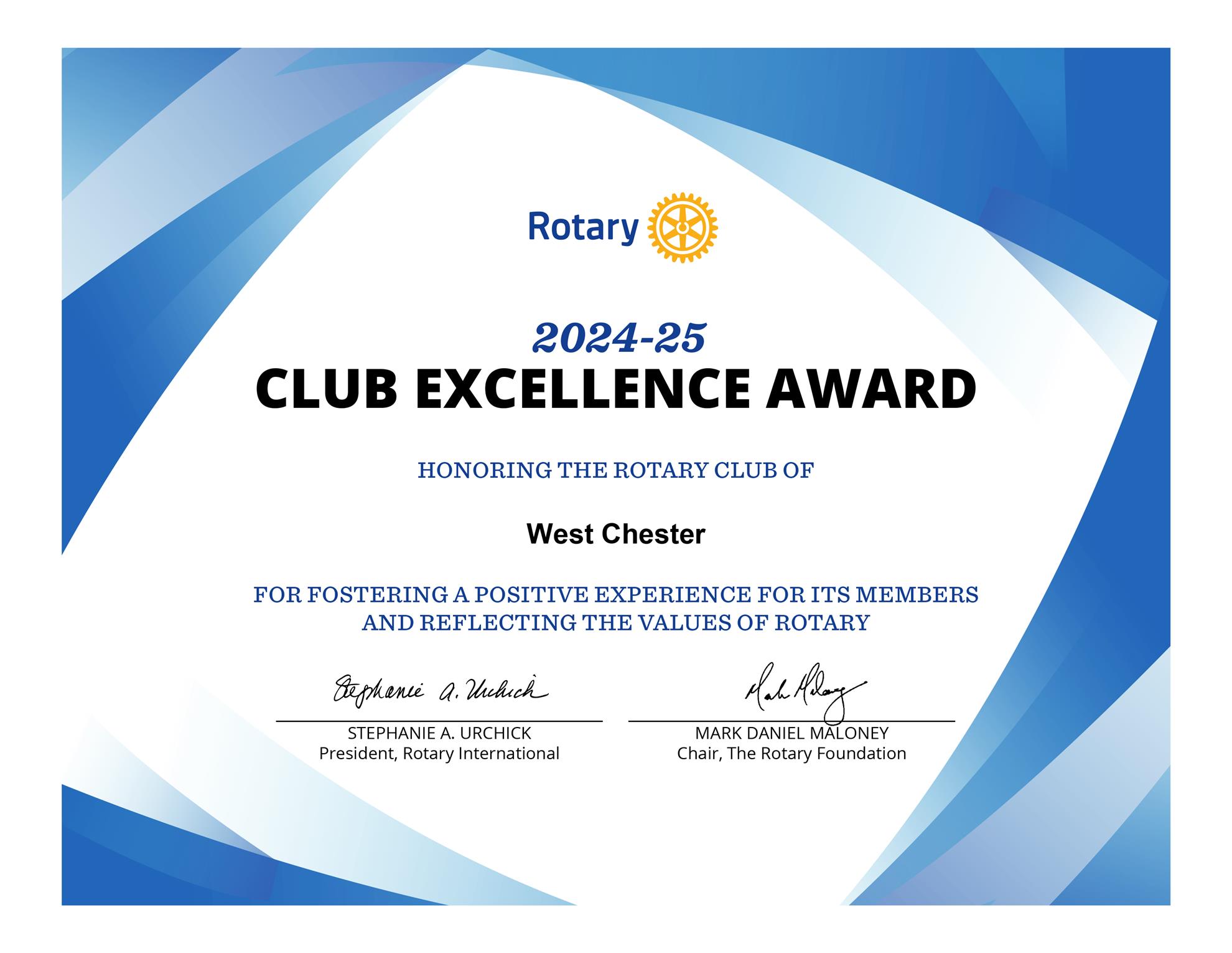 Our Rotary Club recently received recognition from Rotary International, a Club Excellence Award. Current club president, Kyle Rheiner, at a recent luncheon meeting, presented the award to Catherine Friedman, who was president of the club in the 2024-25 program year, providing outstanding leadership, directing and overseeing the activities of our club. Our club is one of just five clubs of the 54 in our 7450 District to earn this award! Other clubs who also earned the award are Chester, Chestnut Hill, Glendale-Abbington and King of Prussia.Stephanie Urchick, 2024-25 Rotary International President, sent these greetings, "Congratulations! Your club has earned the Club Excellence Award, the most significant award a Rotary Club can achieve for 2024-25. Your club demonstrated a commitment to achieve its goals, which ultimately help strengthen Rotary and shape our future."